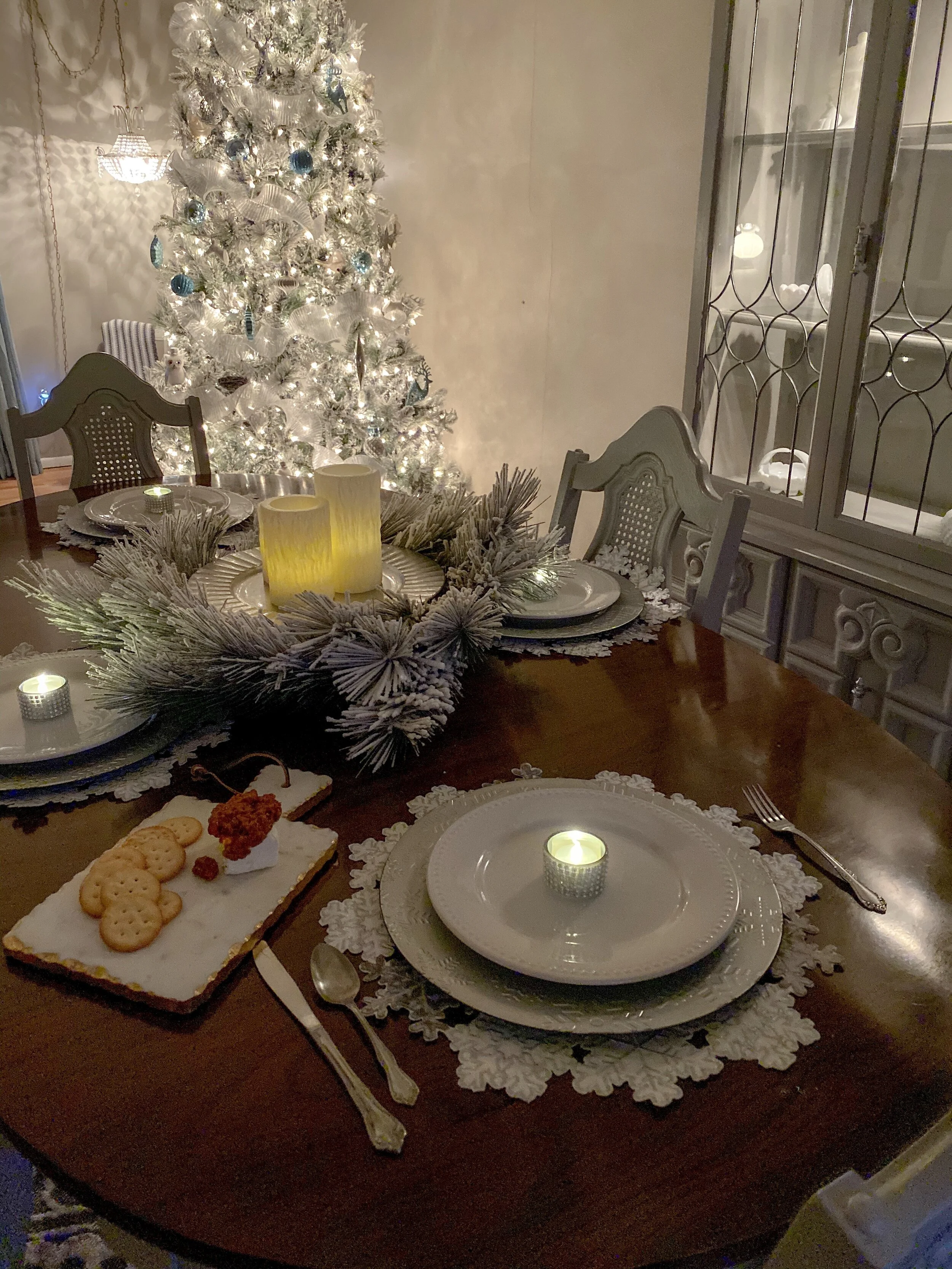 These silver chargers automatically make normal place settings glam, and the snowflake placemats perfectly create a winter theme. I love adding a little something to each place setting, and these glam tealight holders are the perfect finishing touch.