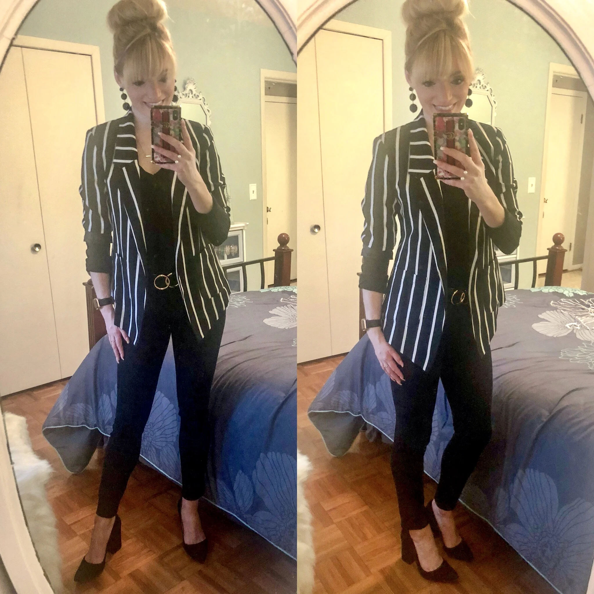 Classic Silhouette with black and white striped blazer, black jeans, and black block heels
