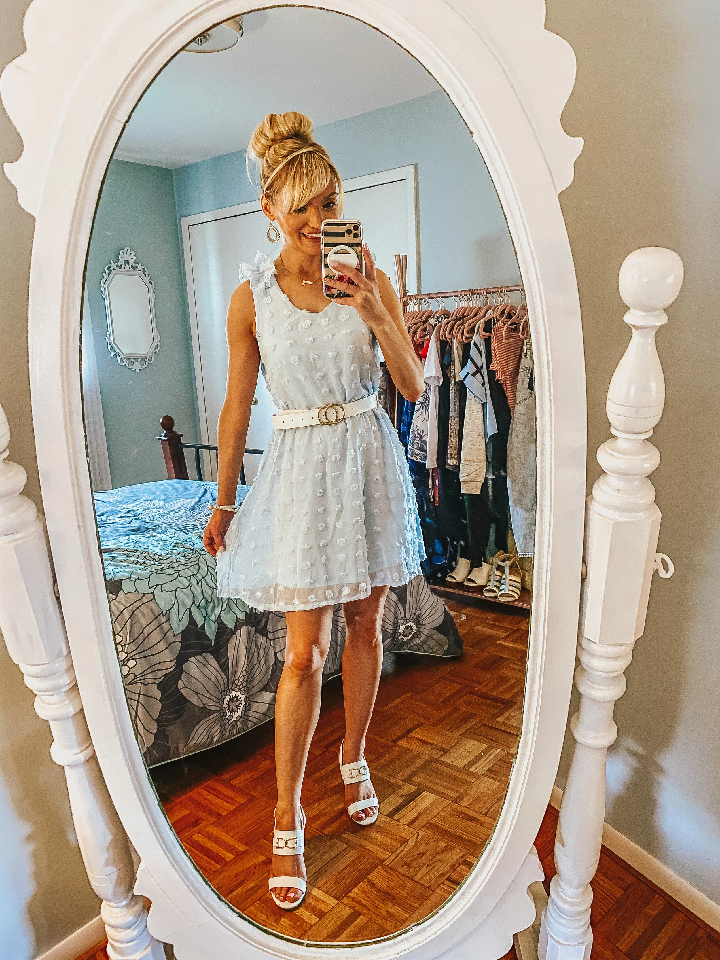 I absolutely fell in love with this beautiful blue summer dress that reminded me of a more casual version of a Cinderella dress! The blue is so perfect and feminine. It is perfect with a top knot, as you are able to show off the ruffle sleeves. I styled mine with white accessories—white belt to define the waist and on trend white block heels to make it more summer casual appropriate.