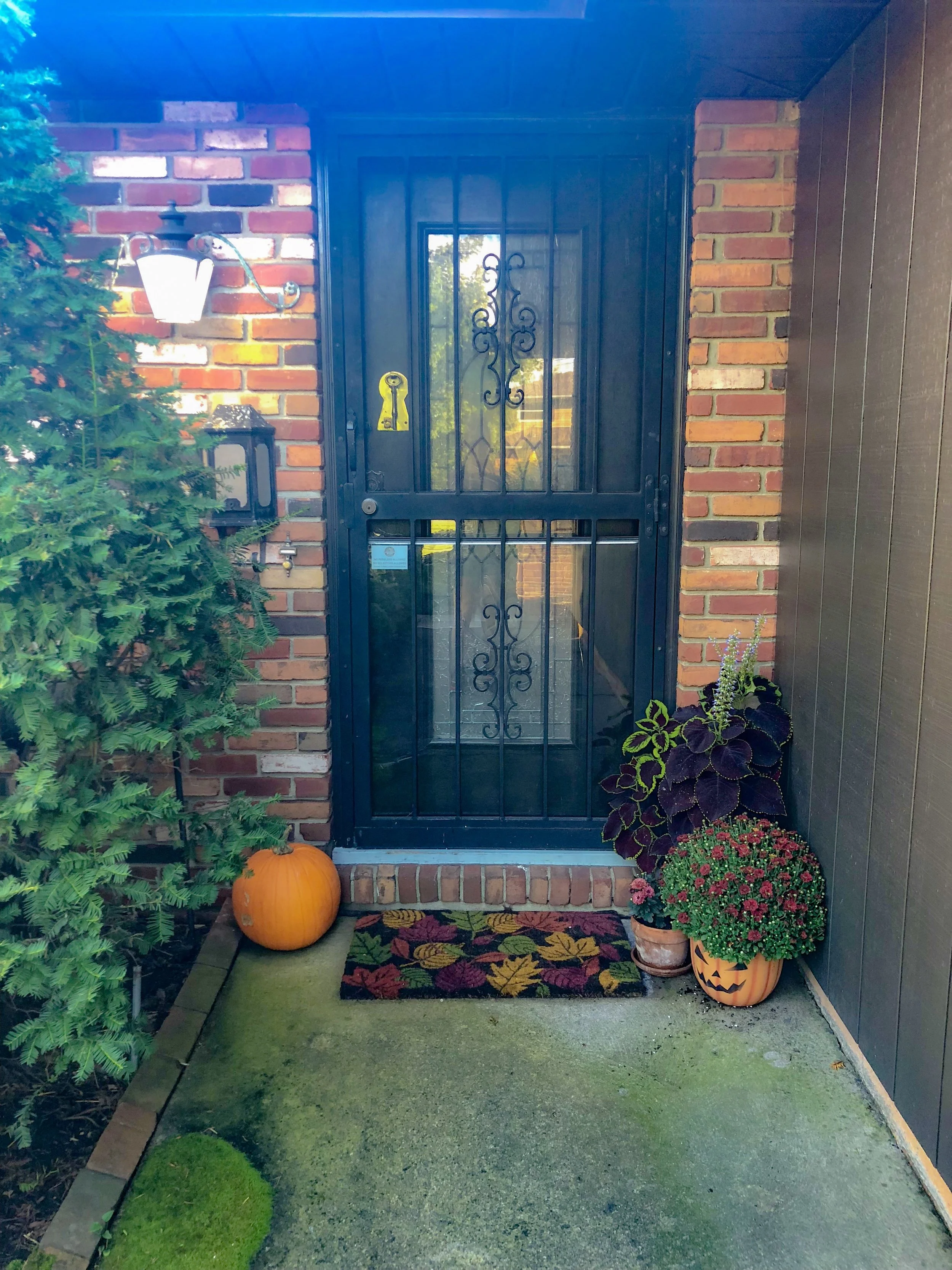 I do not have a front porch or a ton of steps to accomplish the numerous mums and pumpkins look that you often see, but I do try to create a cute fall vignette by my front door. A classic orange pumpkin, leaves doormat, and a halloween themed pumpkin planter with mums creates a festive yet simple look.