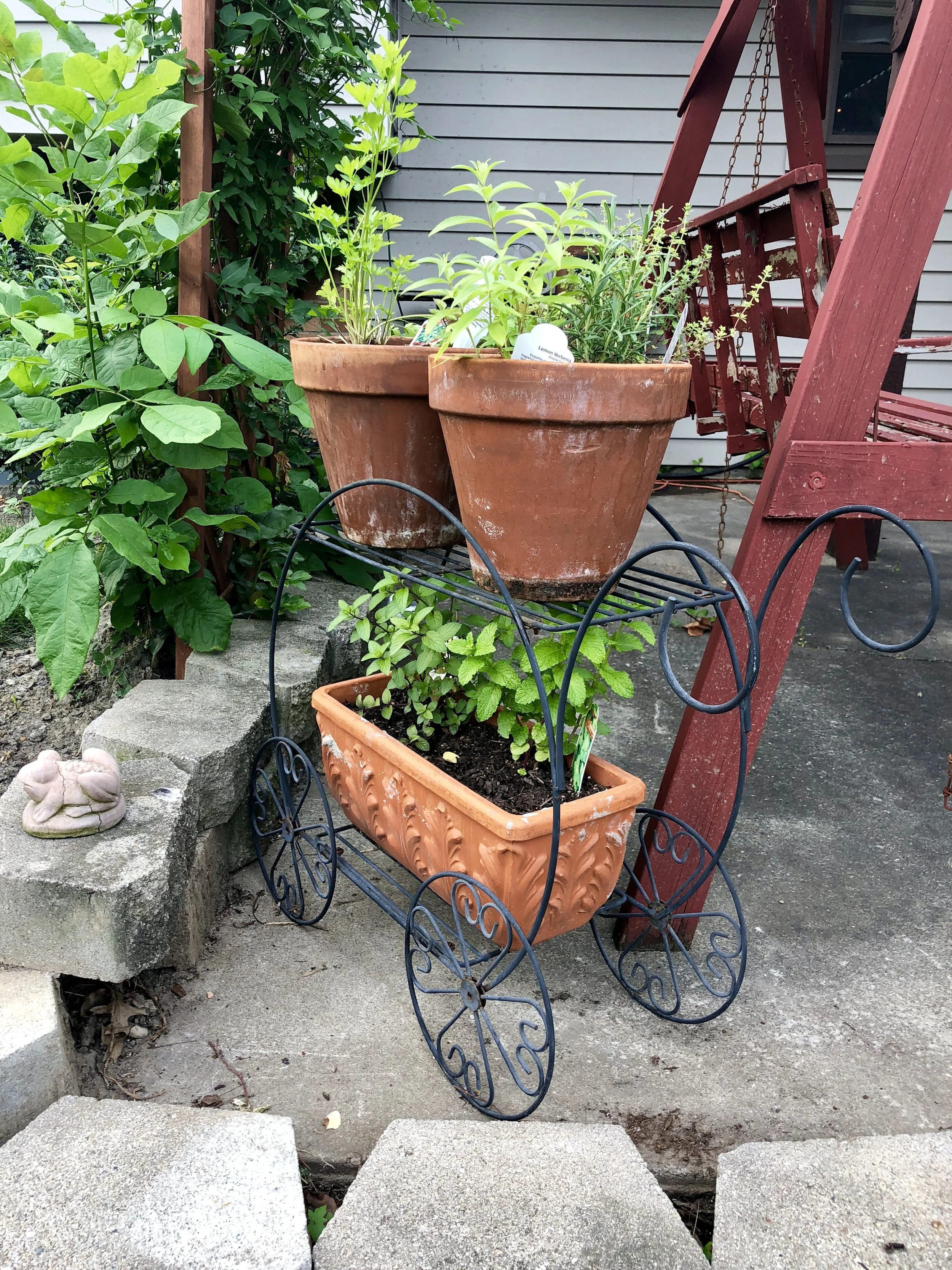 As summer approached, I still had no plan on what I was going to do with my herbs on the patio. I randomly went to an estate sale with my parents in Bath, and lo and behold, I came across this super cute metal stand. Immediately, I thought of using it for my herbs. So I bought it!