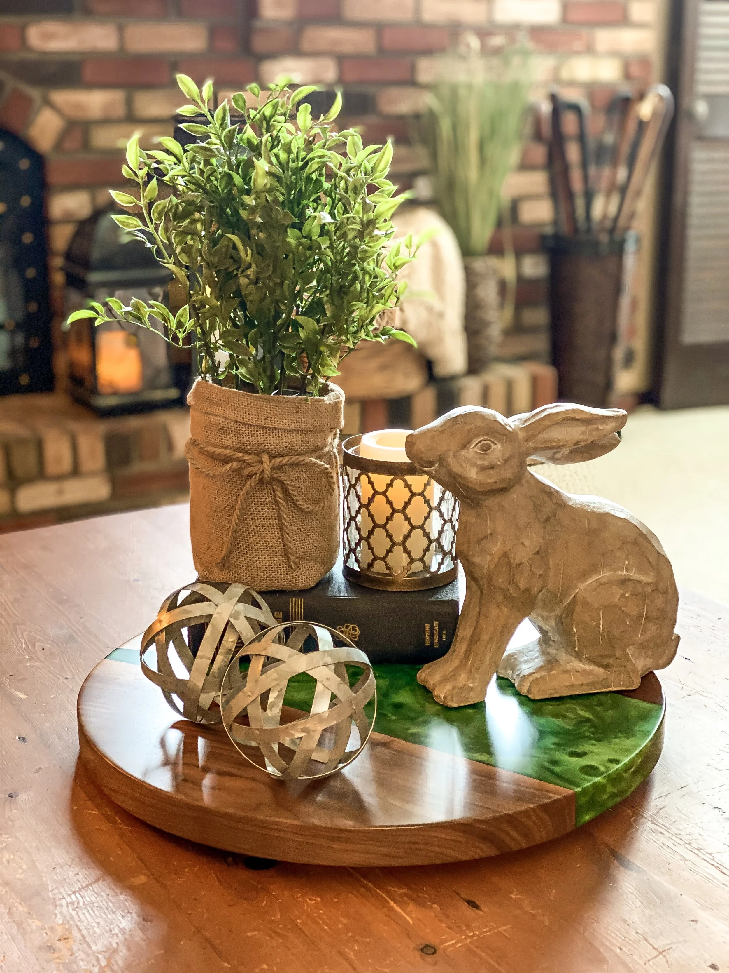 In addition, being at home more in “quarantine” makes me want my home to be even more relaxing, pretty, and cozy. I also found that this Lazy Susan from Lakota Lane made the perfect spring addition to my rustic rec room.