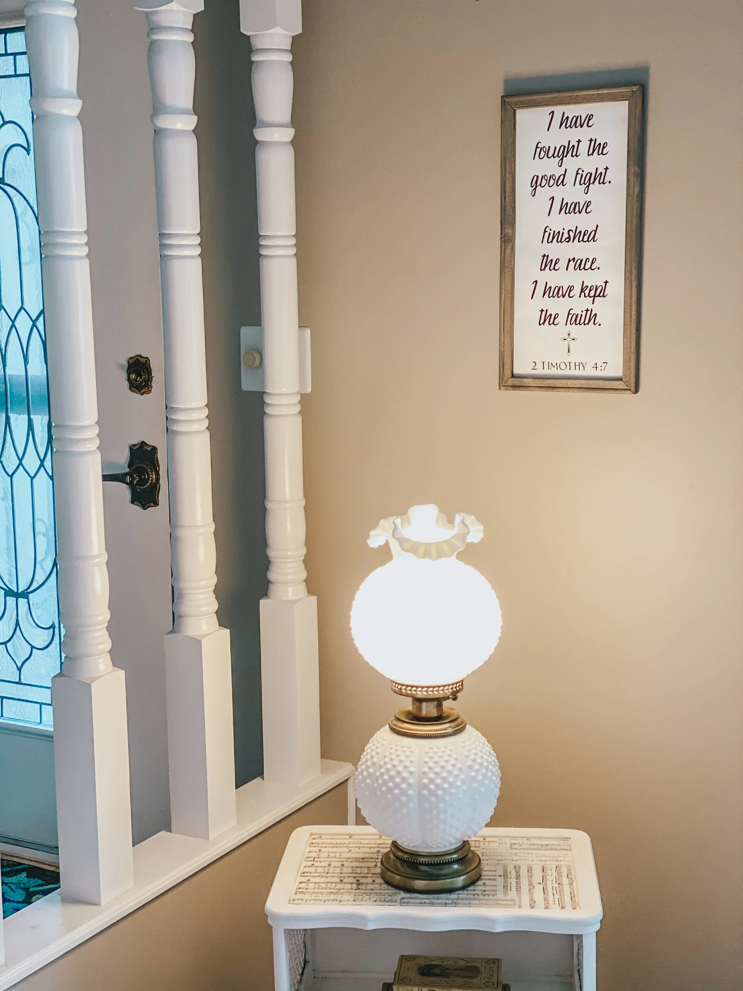 I am continuing to work on finishing my living room, but when I created this little vignette in the corner by the door, I knew I needed something on the wall. I upcycled this table with chalk paint and some music sheets and added this vintage milk glass lamp that was my parent’s from when they first got married. I loved the vintage, farmhouse vibe and pretty much knew that I wanted to hang something there that was personal—my favorite Bible verse.