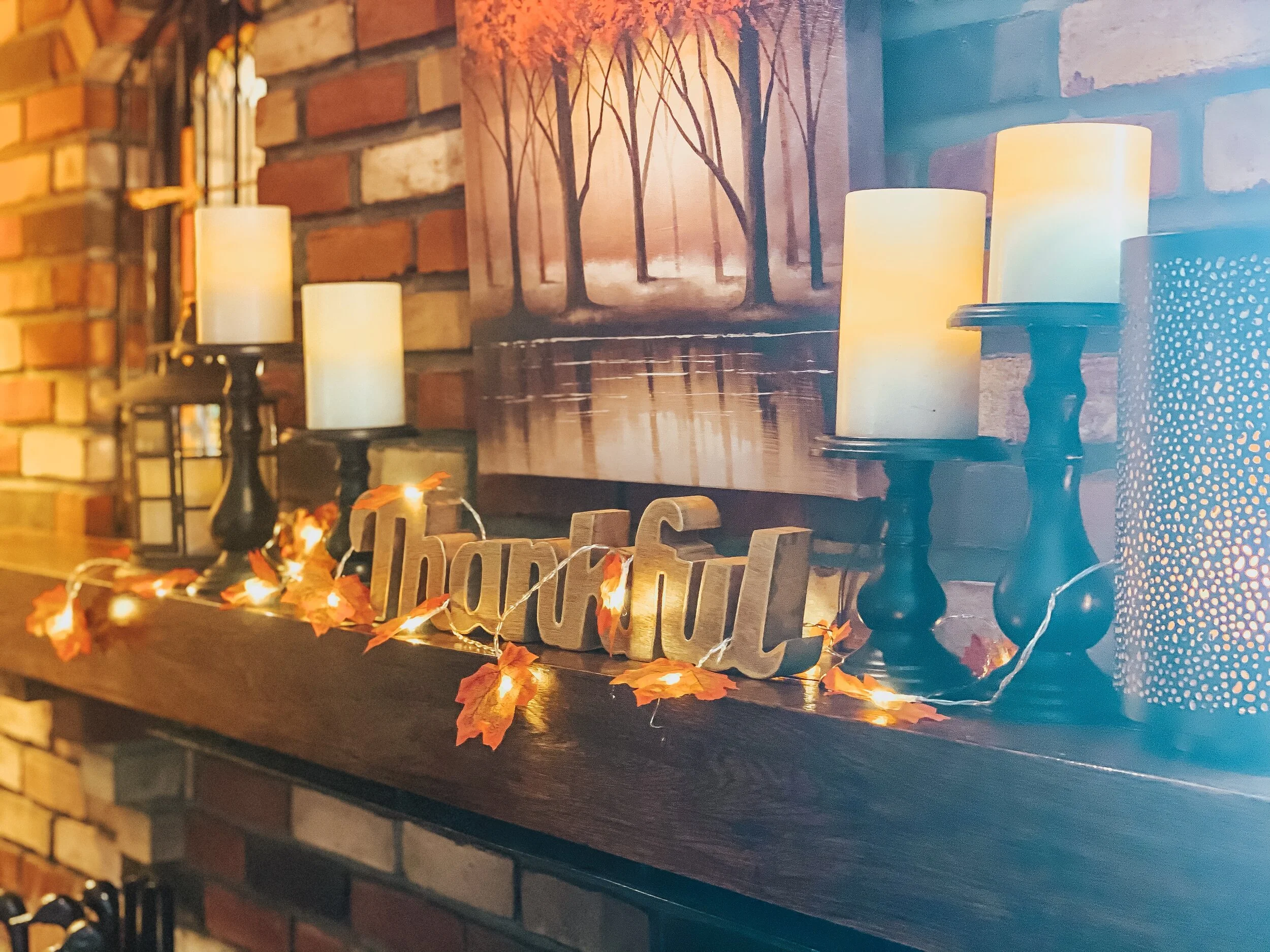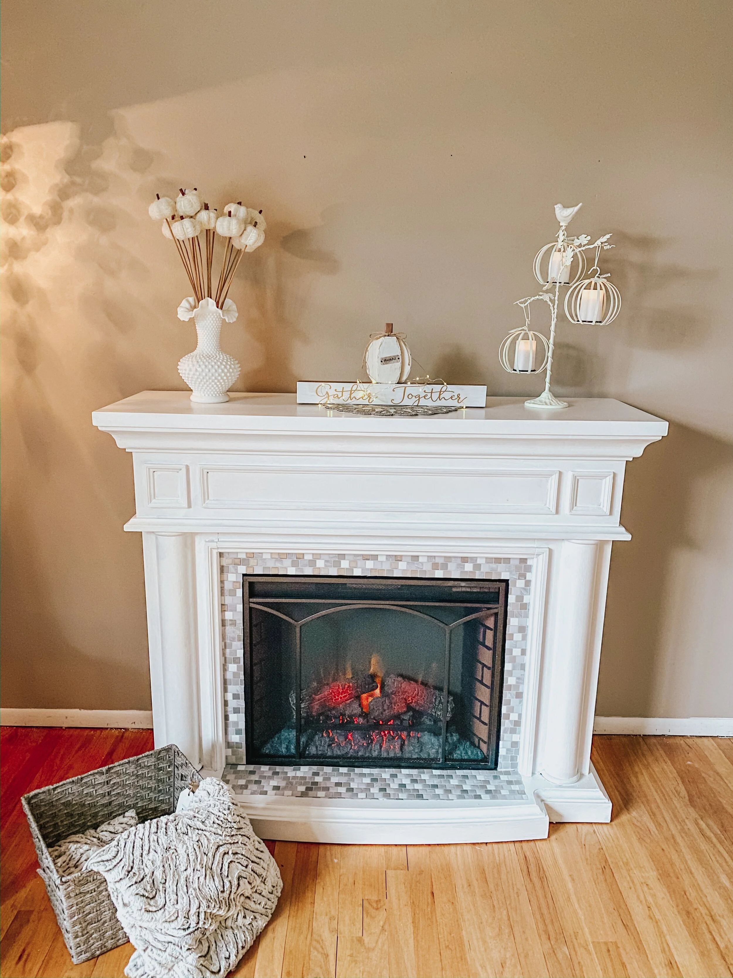 I ended up re-using my “Thankful” Mantel sign again this year, along with my LED fall leaf string lights from Amazon. I used these lights in my fireplace florals last season but am liking the warm light they add on the mantel. I also updated my fall florals on the fireplace with some wheat grass placed with older florals, such as burnt orange flowers and pumpkins. I decided to keep one of my best selling throws from Amazon in my blanket basket (I will update it for the holidays!) to soften the warm fall colors.