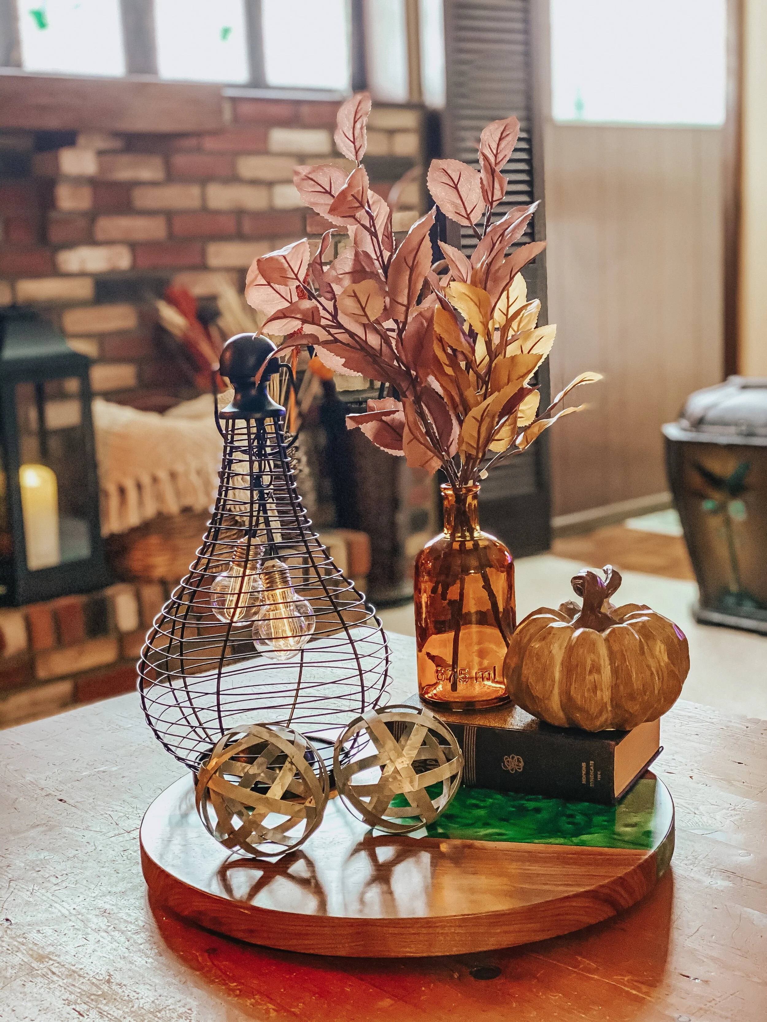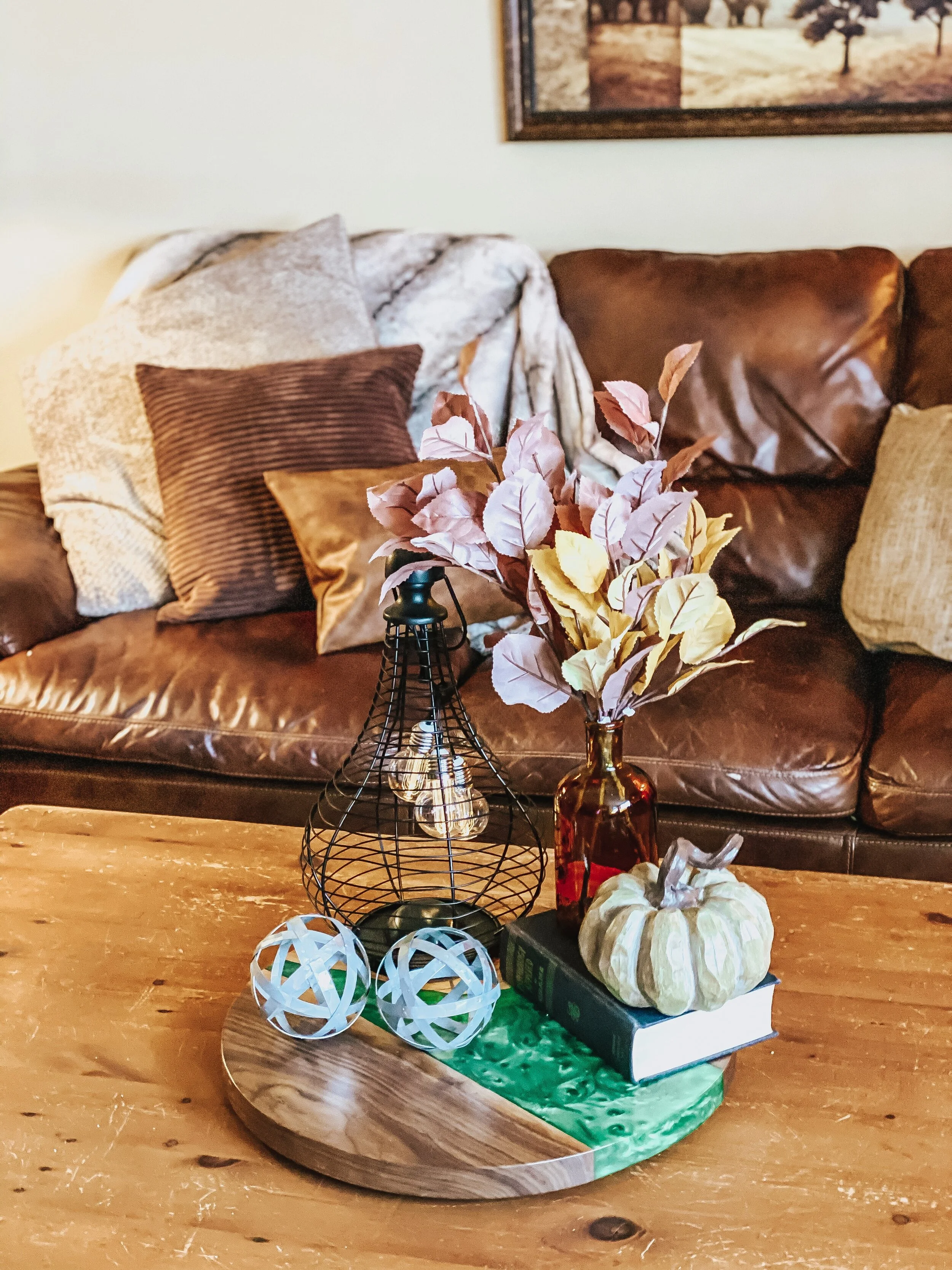 One of my favorite all-year decor additions that I made this spring was this gorgeous Lazy Susan from Lakota Lane, a small business that creates hand-crafted wood decor products. This Lazy Susan is gorgeous walnut with green epoxy in-lay. It can be used for serving or for decor, but I absolutely love the earthy tones and pop of green in my family room. I have been using this on my coffee table since the spring and have been changing up the decor to match the seasons (click here to read my original blog post on the Lazy Susan). I just made a couple simple changes including the additional of this Magnolia Home vase and florals from Target and this fun wooden pumpkin from Big Lots.