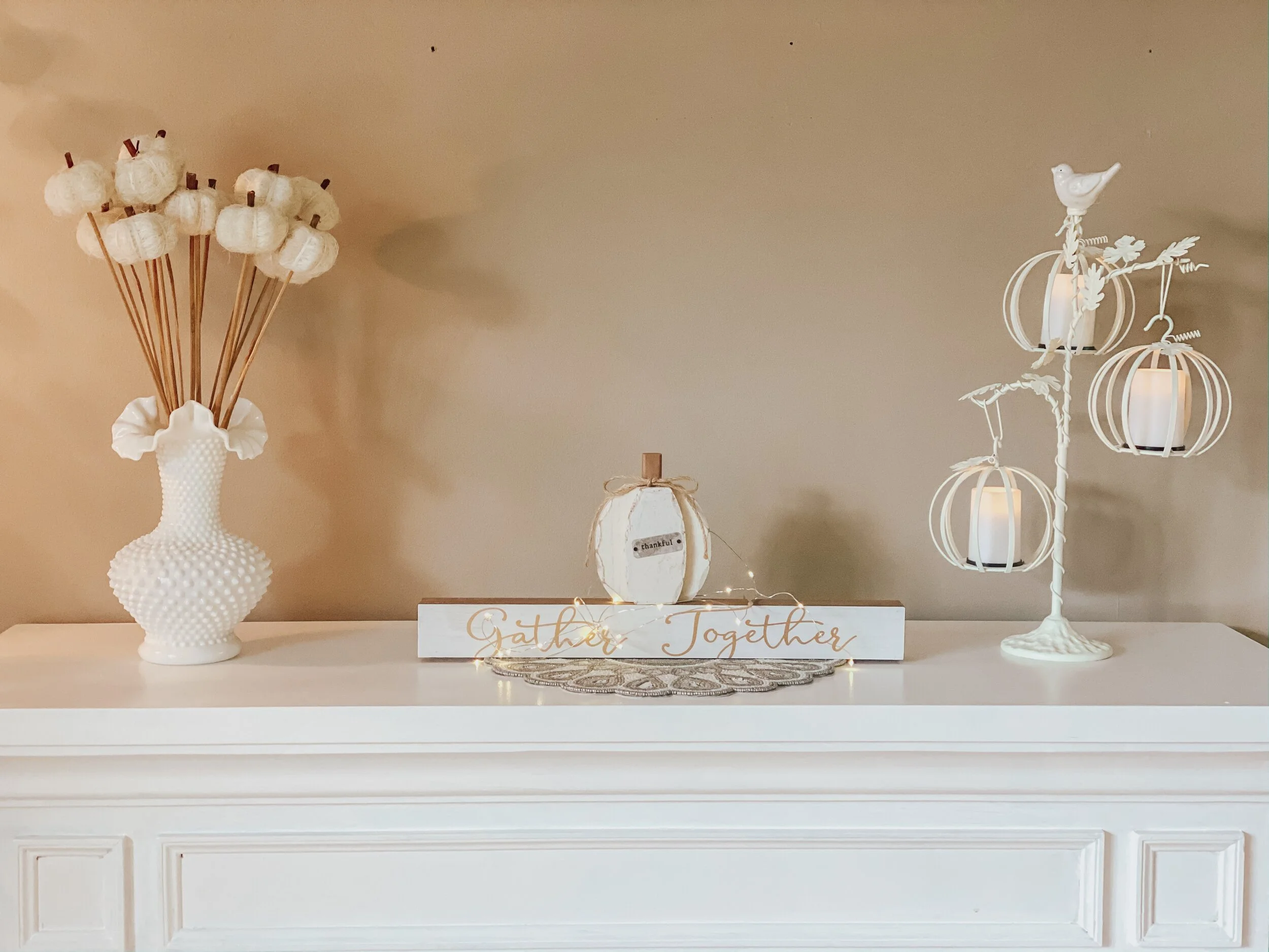 I created a focal point on the center of the mantel by stacking these two fall decorative pieces from Big Lots. One says “Gather Together” (linked up), and the other is a wood pumpkin that says “Thankful” (sold out). Last year, I got this pumpkin lantern from QVC (still available) and used it on one corner while placing this cream pumpkin sticks in my vintage milk glass vase on the other!
