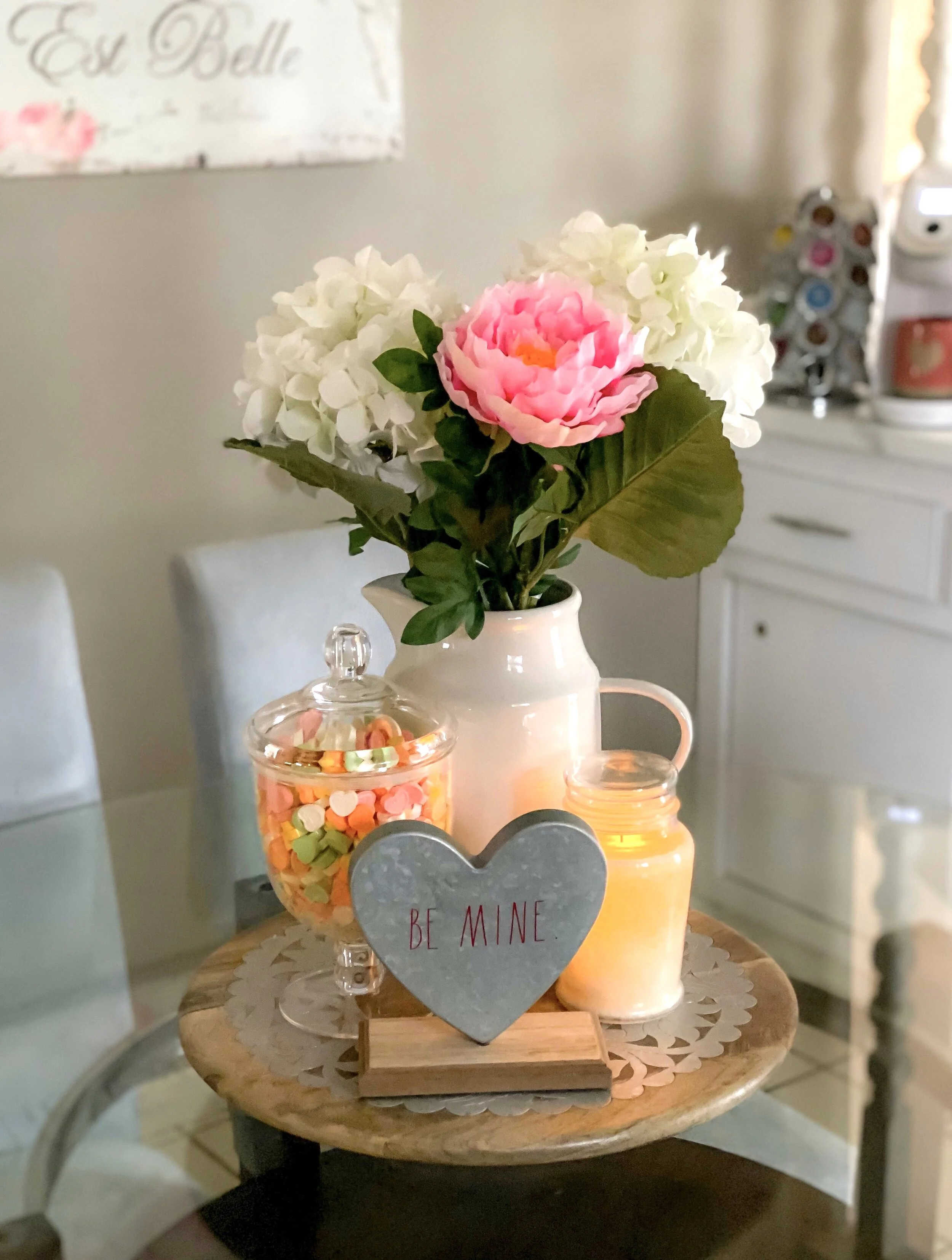 I have really liked using the Lazy Susan as a decorative tray in my kitchen and having the ability to easily change up the centerpiece for each season with new items! I picked up wood and metal Lazy Susan from TJ Maxx about two years ago, and it has been a staple on this table ever since. It was such a great deal—you always have to check out TJ Maxx for these types of things! I am loving re-using my fake hydrangeas and peonies in my farmhouse pitcher. The battery operated candle brings some light, and the use of the apothecary jar, candy hearts, and Rae Dunn heart (also a TJ Maxx find) add the perfect festive vibe.