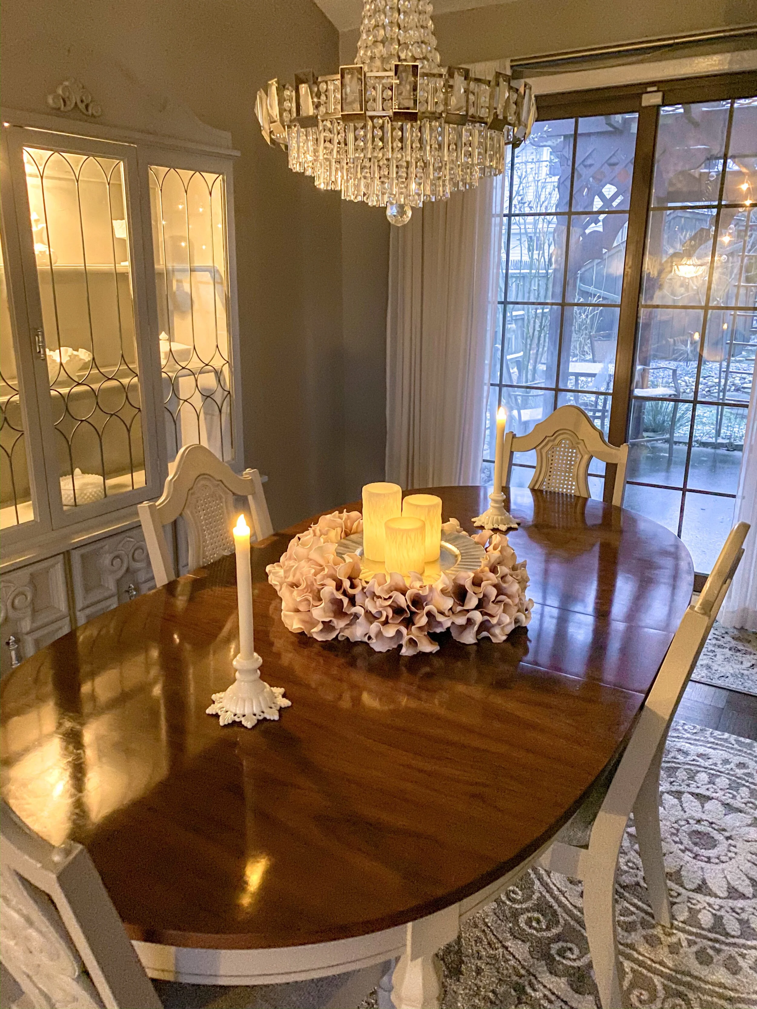 As usual, I always like the look of a festive wreath around a charger and candles. These LED candles from Big Lots have been on display since Christmas 2018, as they transcend all seasons with their white light and glitter. I was tired of the flocked wreath I had kept there for early winter and wanted to bring some Valentine’s Day color into the mix. I had shopped around everywhere and finally found this perfect blush pink wreath from TJ Maxx (they always have the best stuff). I thought it was perfect for Valentine’s Day and something I will easily use through spring (you know I will probably change it up for Easter!). I brought out my milk glass candle holders and was so excited to find these perfect battery operated LED tapered candles from Amazon. They come in a set of 8 and have the perfect glow—not too yellow. Plus, they are covered in wax for a real feel and turn on the the touch of a hand! I love this look and will keep it up through March!